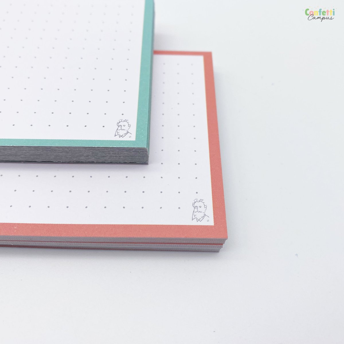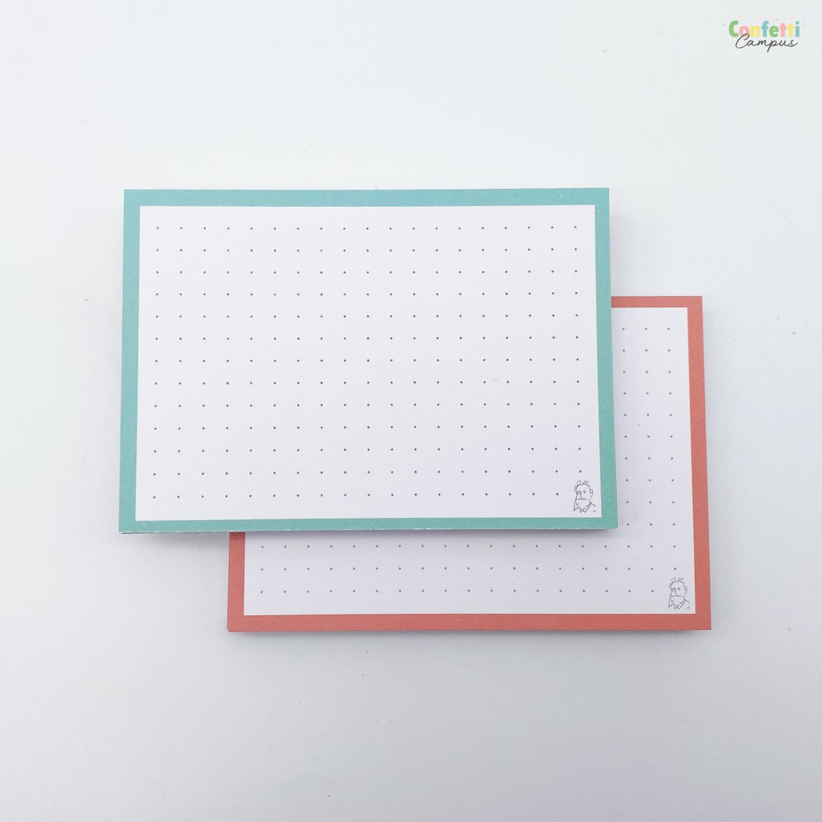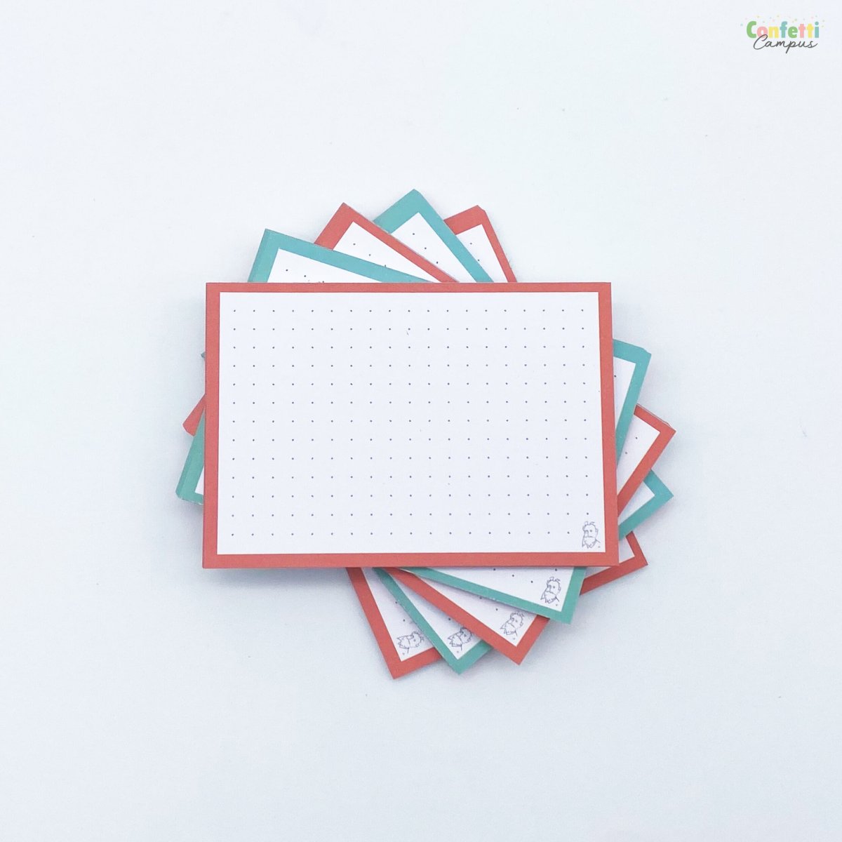 Les flashcards Leitner A7 mesurent 7,4 cm de haut et 10,5 cm de large (format A7 orientation paysage) et sont fabriquées en papier épais certifié FSC de 300 g/m². Imprimées avec une grille géométrique composée de points espacés de 5 mm et imprimés tout en finesse. Les petits points restent discrets mais servent tout de même de points de repère pour l’écriture ou le dessin. C’est typiquement la réglure utilisée pour le Bullet Journal ou BUJO, les croquis et illustrations. Mais les pointillés offrent de manière générale une grande liberté d’écriture: que tu écrives très petit, en version patte-de-mouche, ou au contraire plutôt gros, la réglure à points Dots est faite pour toi.