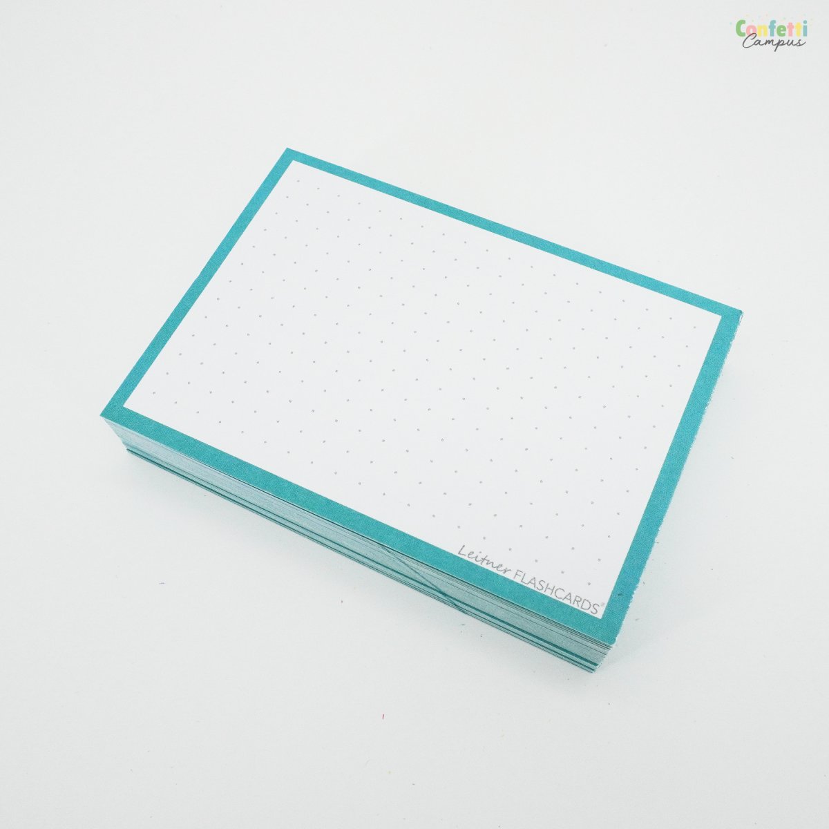 Pack de 50 Flashcards Leitner® ou cartes mémoire, à points, au format A7. Bordure bleu canard ou bleu-vert.