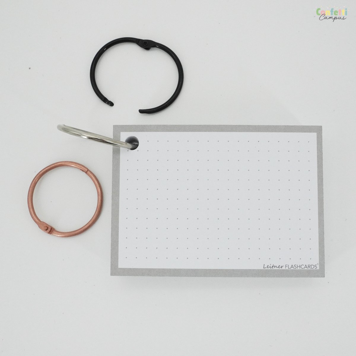 Optionnel: Les flashcards peuvent être « perforées » sur demande. Ajoute à cela un anneau à fermoir et tes cartes mémoire seront ainsi maintenues entre elles et sécurisées. Regroupe-les par thème, examen ou matière. Elles sont également plus faciles à transporter. Pratique pour réviser dans le bus, le tramway ou en voiture. L’anneau fourni est fabriqué en métal solide et possède un fermoir à clic très pratique, facile à ouvrir. Chaque anneau peut rassembler jusqu’à 100 flashcards. Disponibles à l’unité, les flashcards peuvent également être commandées en plus grandes quantités ou combinées avec d’autres produits, à prix réduit, via nos offres à la carte. Elles sont emballées de manière écologique et envoyées par la poste en format lettre ou colis en fonction de leur nombre.