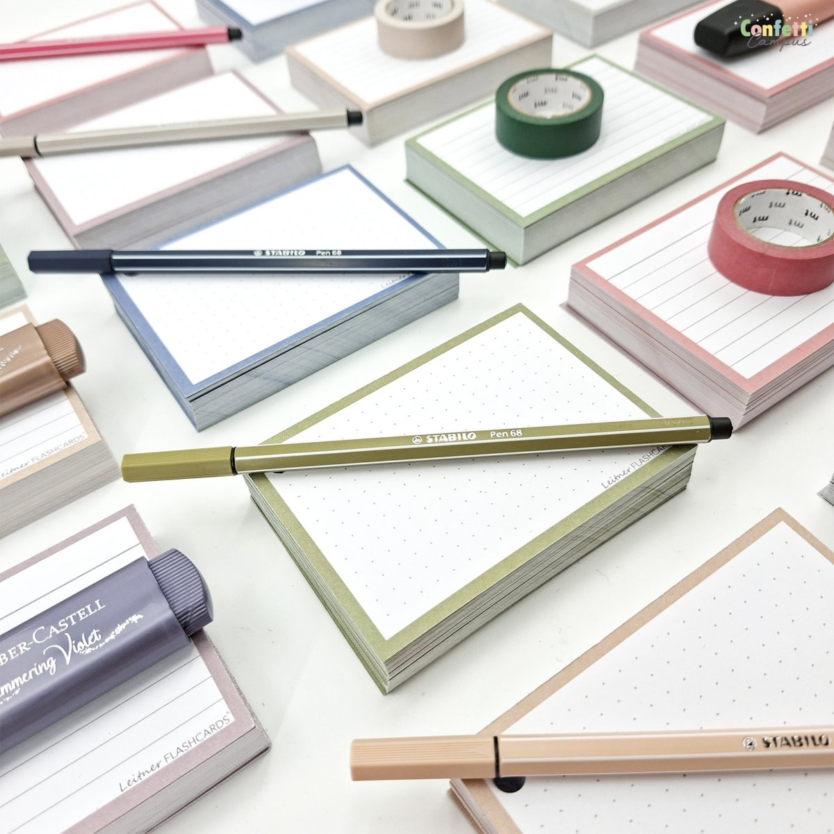 Les flashcards Leitner au format A7 sont les plus populaires. Compactes, elles sont idéales pour apprendre des définitions ou des concepts courts sous forme de Quizz: Question/Réponse, mais aussi Terme/Définition, Date/Evènement, Formule/Résultat, etc… Il te suffit d’écrire la question au recto et la réponse au verso. Tout ce que tu dois apprendre se retrouve alors résumé en une pile de Flashcards. Apprends-les selon le principe de la répétition espacée: chaque jour la pile des « inconnues », tous les 3 jours les « à peu près maîtrisées », tous les 5 jours les « maîtrisées ». Si tu débutes avec la méthode Leitner, les boîtes Leitner et le Leitner Planner sont là pour te guider au quotidien dans cette méthode de travail. 🖼️ Le cadre de couleur n’est pas un gadget esthétique: il sert en réalité à focaliser ton attention à l’intérieur du cadre. Regarde un peu comme tu peux être captivé.e par ton écran de smartphone…😜. De plus, si tu étudies plusieurs matières, il est conseillé d’allouer une couleur à une matière spécifique. Tes flashcards seront alors plus faciles à trier, à l’oeil.