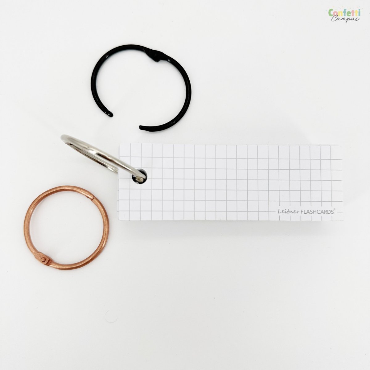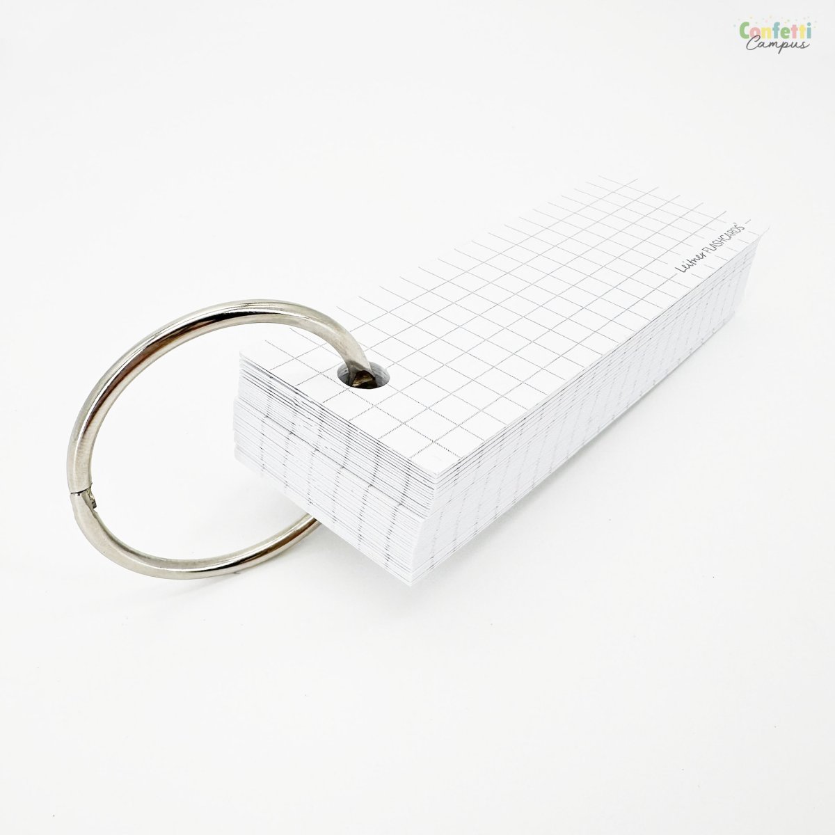 Optionnel: Les flashcards peuvent être « perforées » sur demande. Ajoute à cela un anneau à fermoir et tes cartes mémoire seront ainsi maintenues entre elles et sécurisées. Regroupe-les par thème, examen ou matière. Elles sont également plus faciles à transporter. Pratique pour réviser dans le bus, le tramway ou en voiture. L’anneau fourni est fabriqué en métal solide et possède un fermoir à clic très pratique, facile à ouvrir. Chaque anneau peut rassembler jusqu’à 100 flashcards. Disponibles à l’unité, les flashcards peuvent également être commandées en plus grandes quantités ou combinées avec d’autres produits, à prix réduit, via nos offres à la carte. Elles sont emballées de manière écologique et envoyées par la poste en format lettre ou colis en fonction de leur nombre.