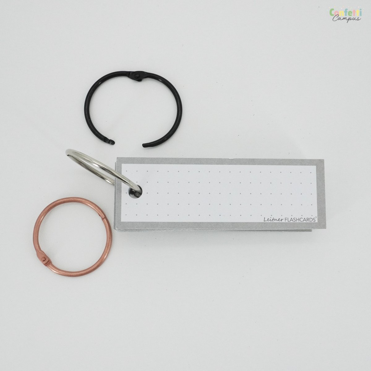 Optionnel: Les flashcards peuvent être « perforées » sur demande. Ajoute à cela un anneau à fermoir et tes cartes mémoire seront ainsi maintenues entre elles et sécurisées. Regroupe-les par thème, examen ou matière. Elles sont également plus faciles à transporter. Pratique pour réviser dans le bus, le tramway ou en voiture. L’anneau fourni est fabriqué en métal solide et possède un fermoir à clic très pratique, facile à ouvrir. Chaque anneau peut rassembler jusqu’à 100 flashcards. Disponibles à l’unité, les flashcards peuvent également être commandées en plus grandes quantités ou combinées avec d’autres produits, à prix réduit, via nos offres à la carte. Elles sont emballées de manière écologique et envoyées par la poste en format lettre ou colis en fonction de leur nombre.