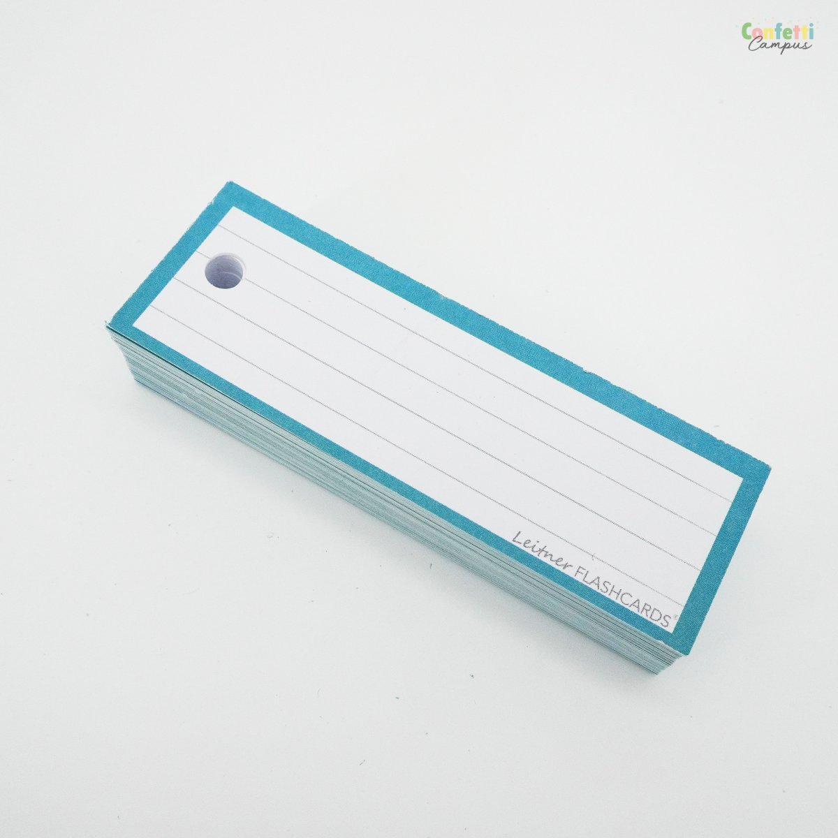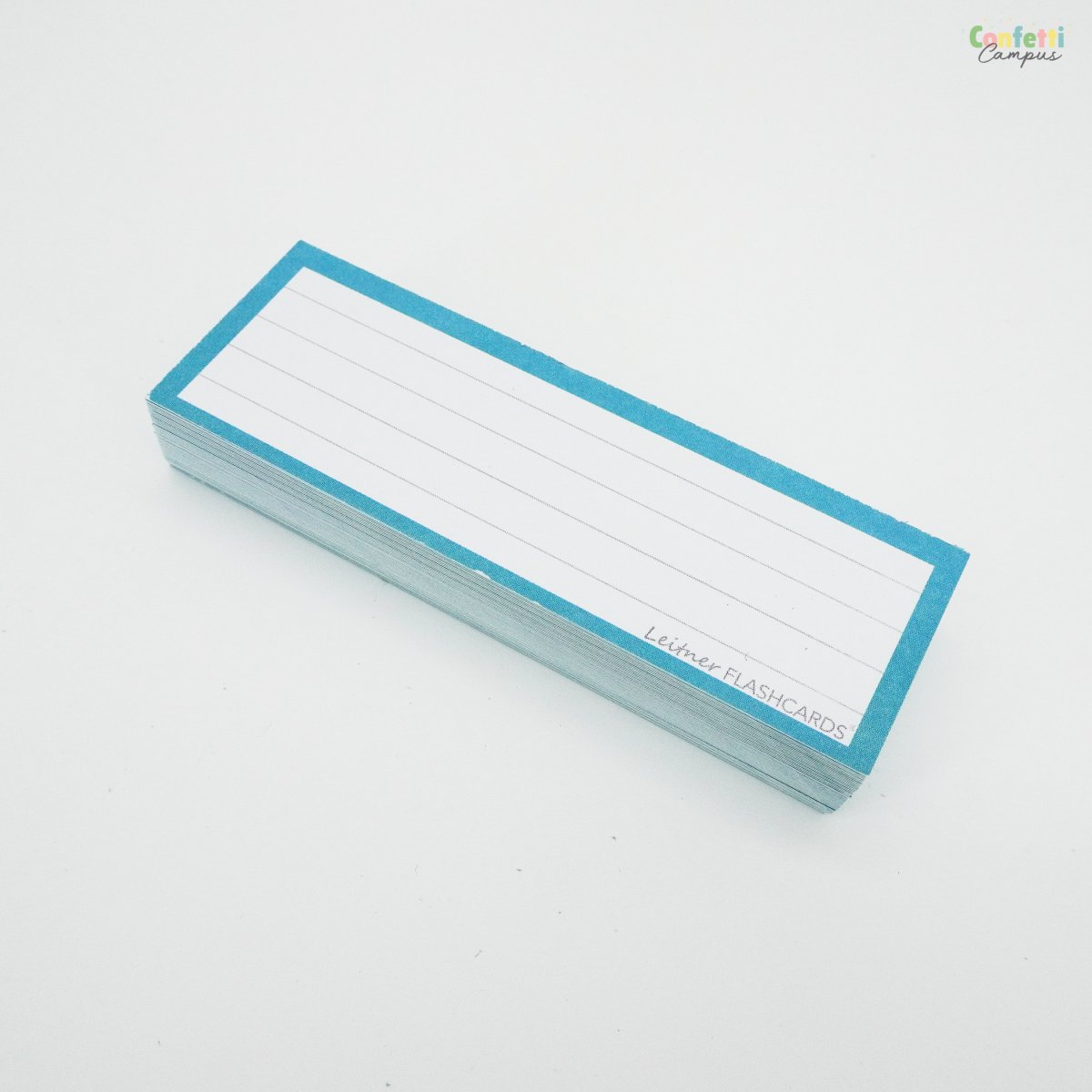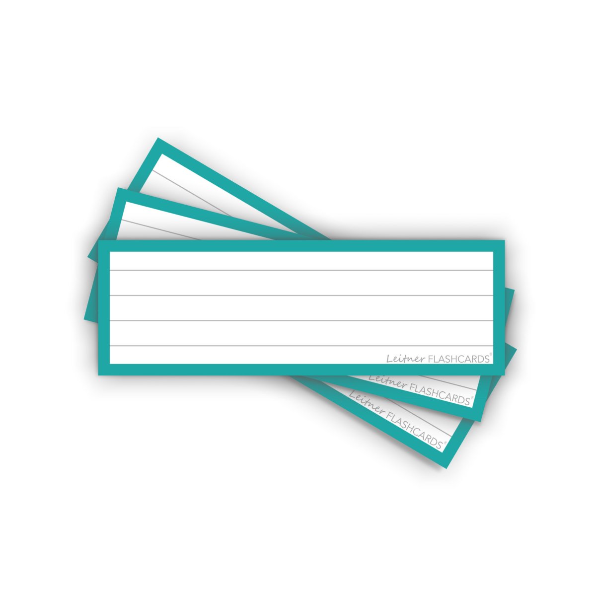 Pack de 50 Flashcards Leitner® Vocabulaire ou cartes de mots, lignées, petit format 3,5×10,5cm. Bordure bleu canard ou bleu-vert.