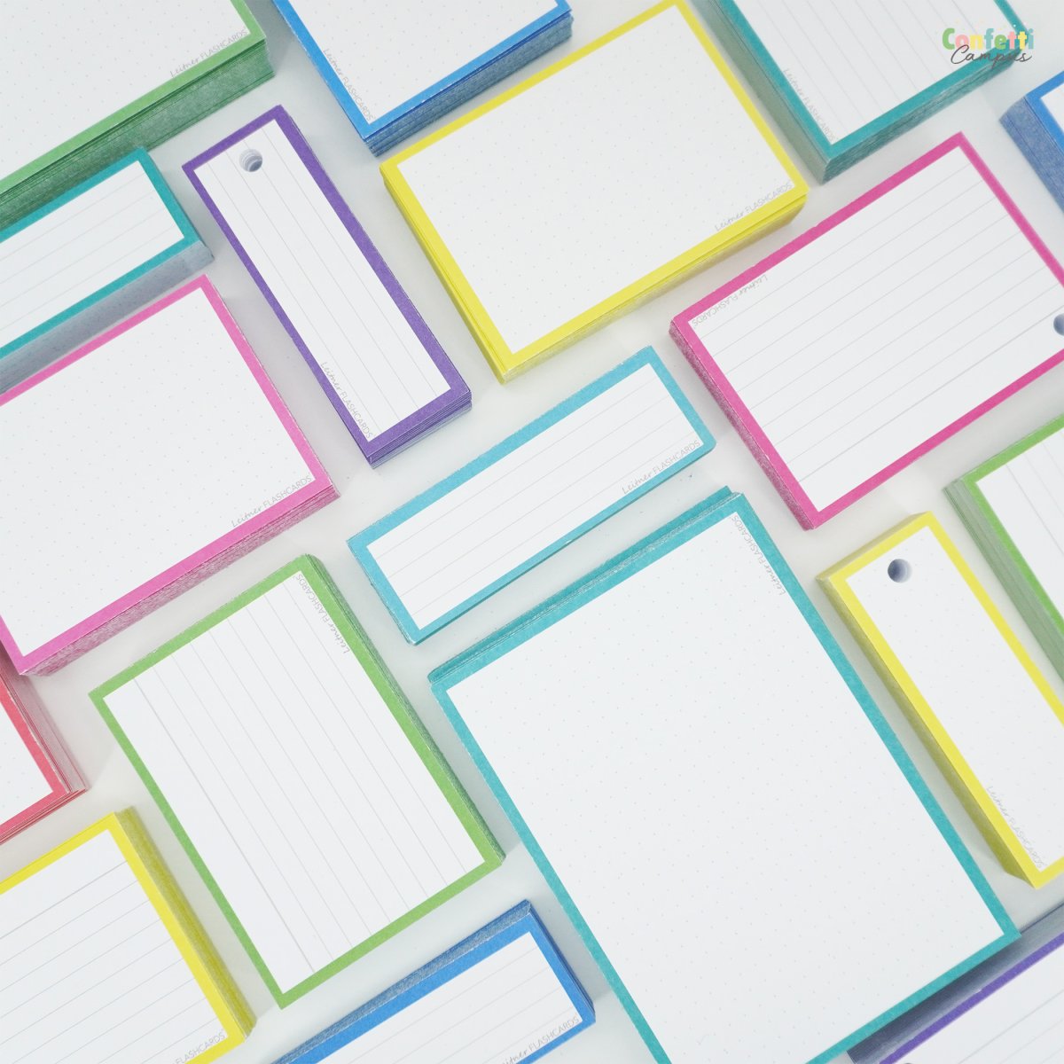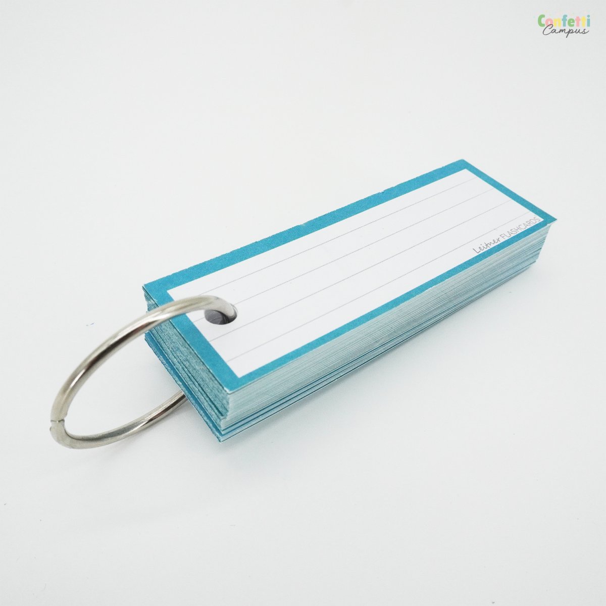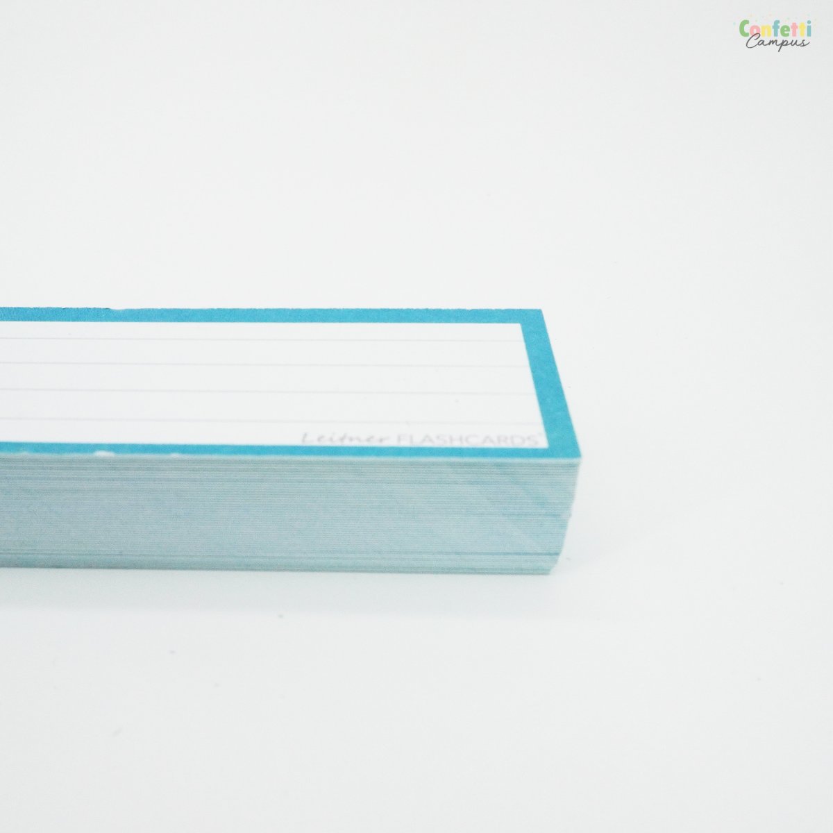 Pack de 50 Flashcards Leitner® Vocabulaire ou cartes de mots, lignées, petit format 3,5×10,5cm. Bordure bleu canard ou bleu-vert.