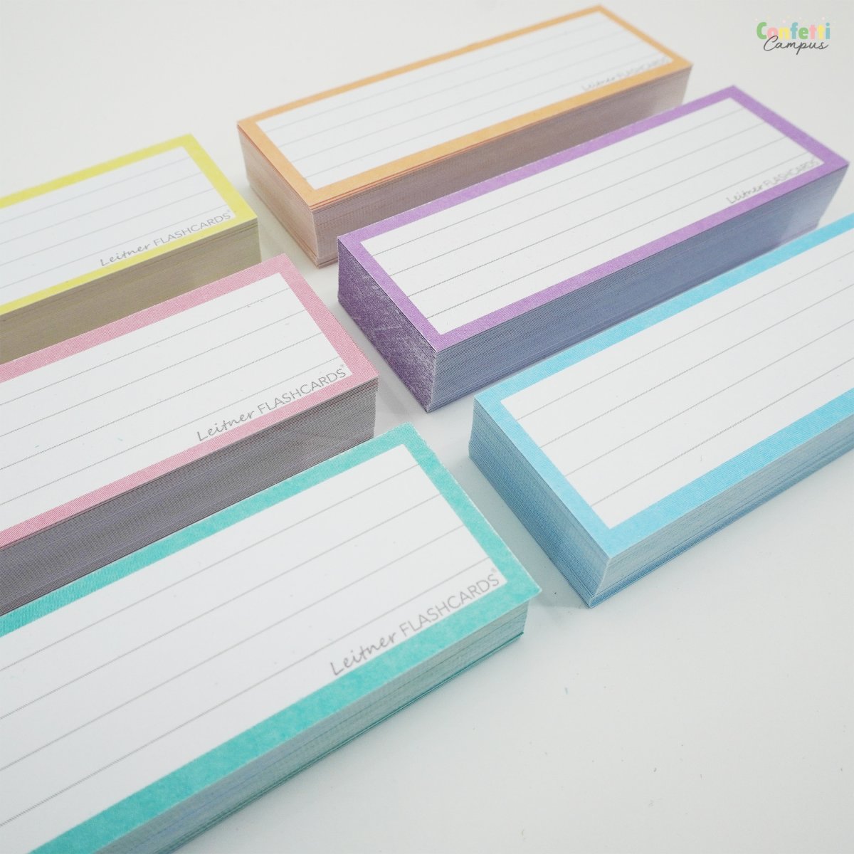 Les demi flashcards Leitner ou Cartes de mots, les plus petites, sont particulièrement adaptées pour l’apprentissage d’une langue. Ecris le mot à apprendre au recto et sa traduction ou ses variantes (verbes irréguliers par exemple) au verso. Tout ce que tu dois apprendre se retrouve alors résumé en une pile de Flashcards. Apprends-les selon le principe de la répétition espacée: chaque jour la pile des « inconnues », tous les 3 jours les « à peu près maîtrisées », tous les 5 jours les « maîtrisées ». Si tu débutes avec la méthode Leitner, les boîtes Leitner et le Leitner Planner sont là pour te guider au quotidien dans cette méthode de travail. 💡 Quand tu apprends des mots, si possible lis-les à voix haute. Non seulement tu t’exerces à la prononciation mais tu les mémoriseras encore mieux: répéter tout haut une information induit un meilleur « souvenir » que lorsqu’elle est simplement lue en silence. 🖼️ Le cadre de couleur n’est pas un gadget esthétique: il sert en réalité à focaliser ton attention à l’intérieur du cadre. Regarde un peu comme tu peux être captivé.e par ton écran de smartphone…😜. De plus, si tu étudies plusieurs matières ou langues, il est conseillé d’allouer une couleur à chacune. Tes flashcards seront alors plus faciles à trier, à l’oeil.