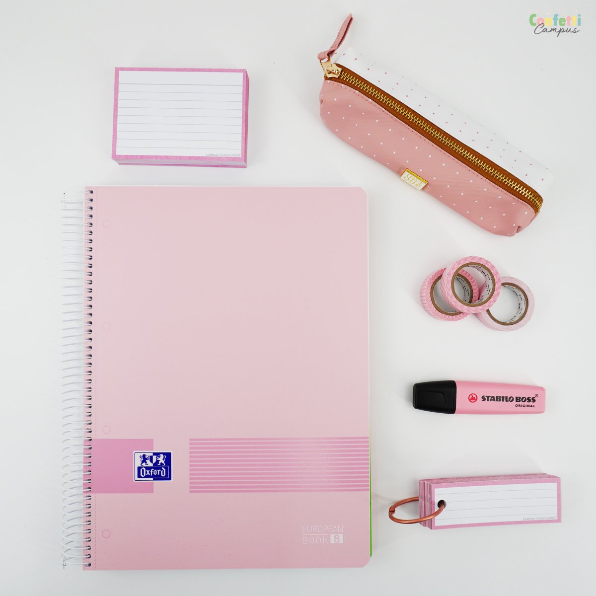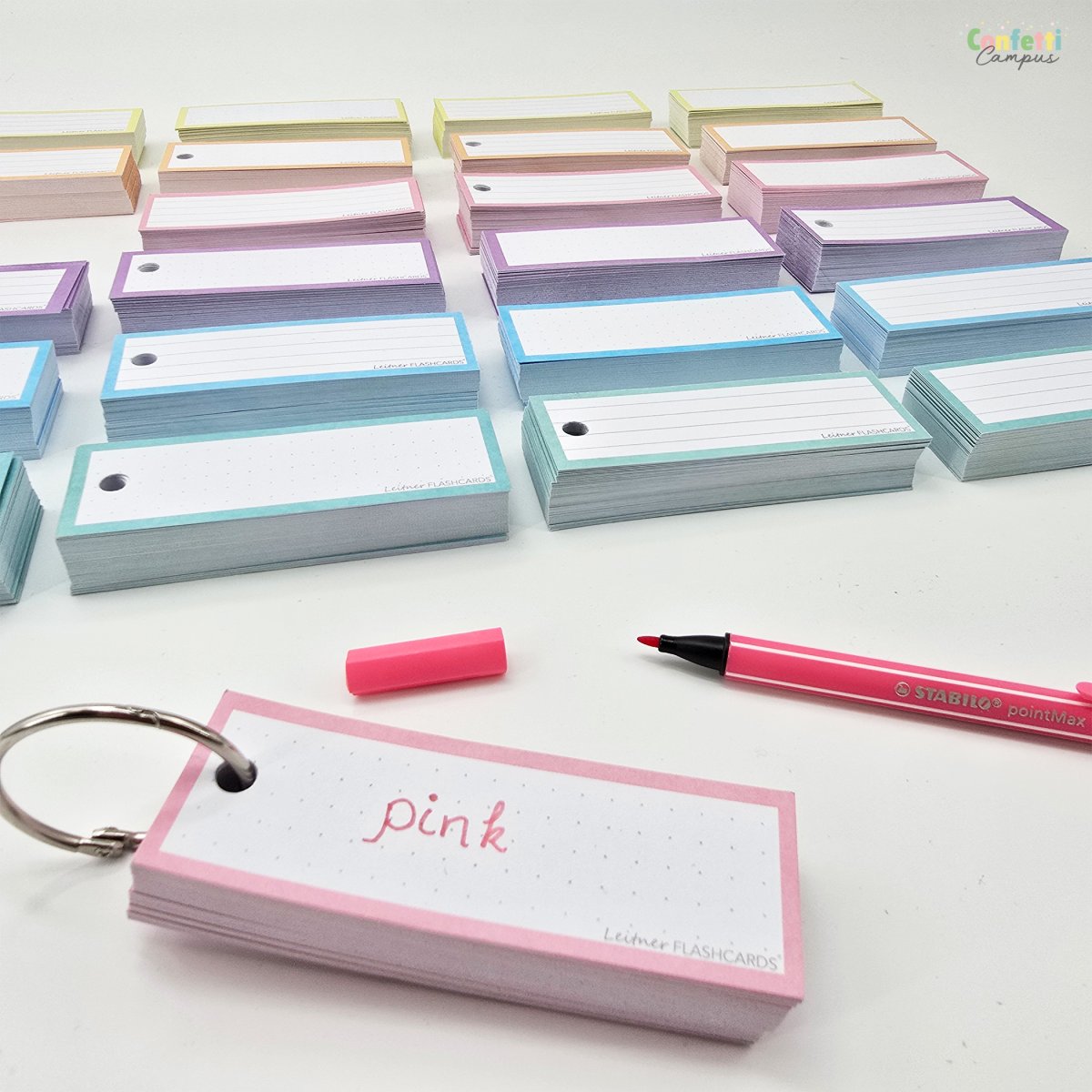 Pack de 50 Flashcards Leitner® Vocabulaire ou cartes de mots, lignées, petit format 3,5×10,5cm. Bordure rose pastel.