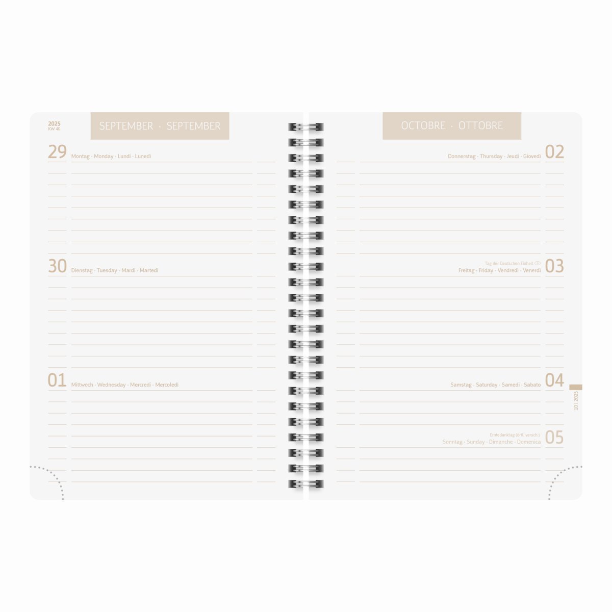 - Reliure intégrale ou double spirale blanche : Pour une ouverture à plat impeccable et la possibilité de replier ton agenda sur lui-même.