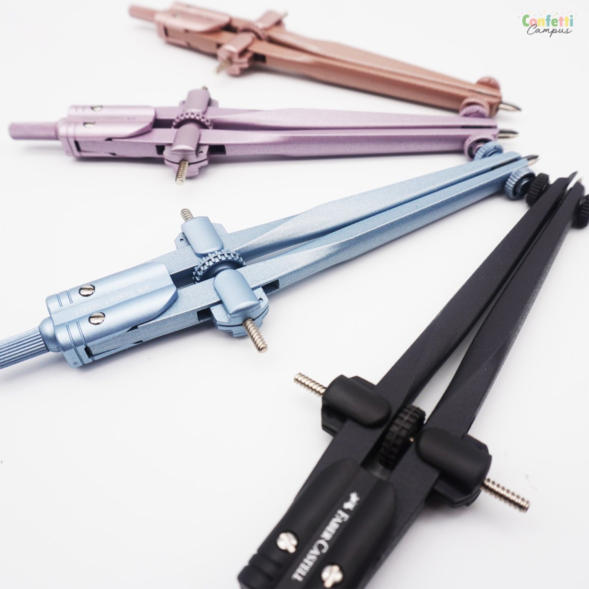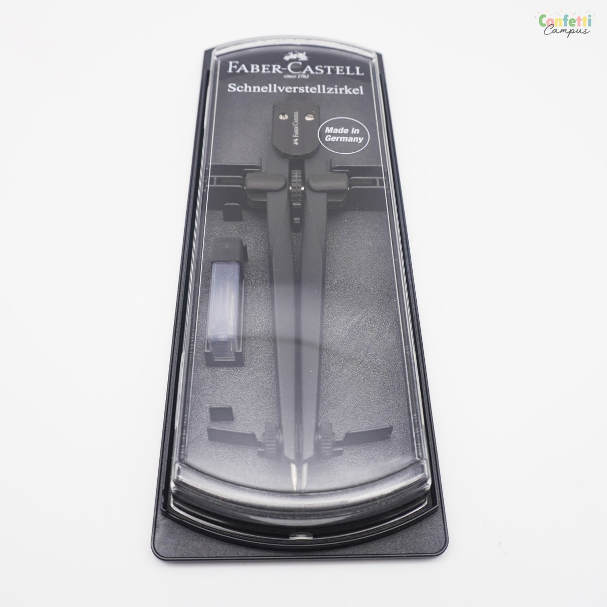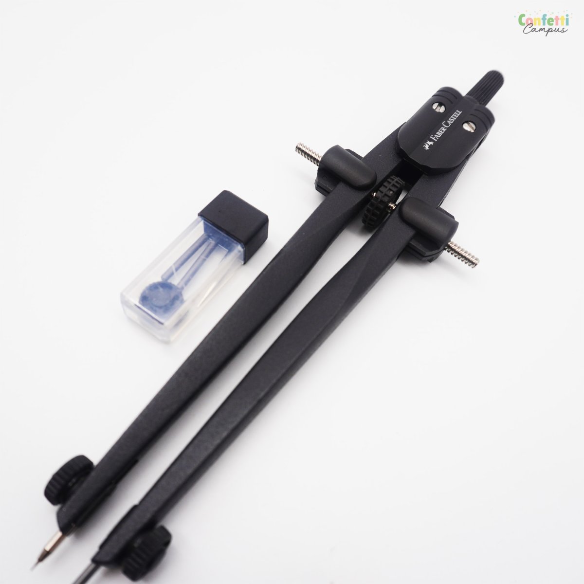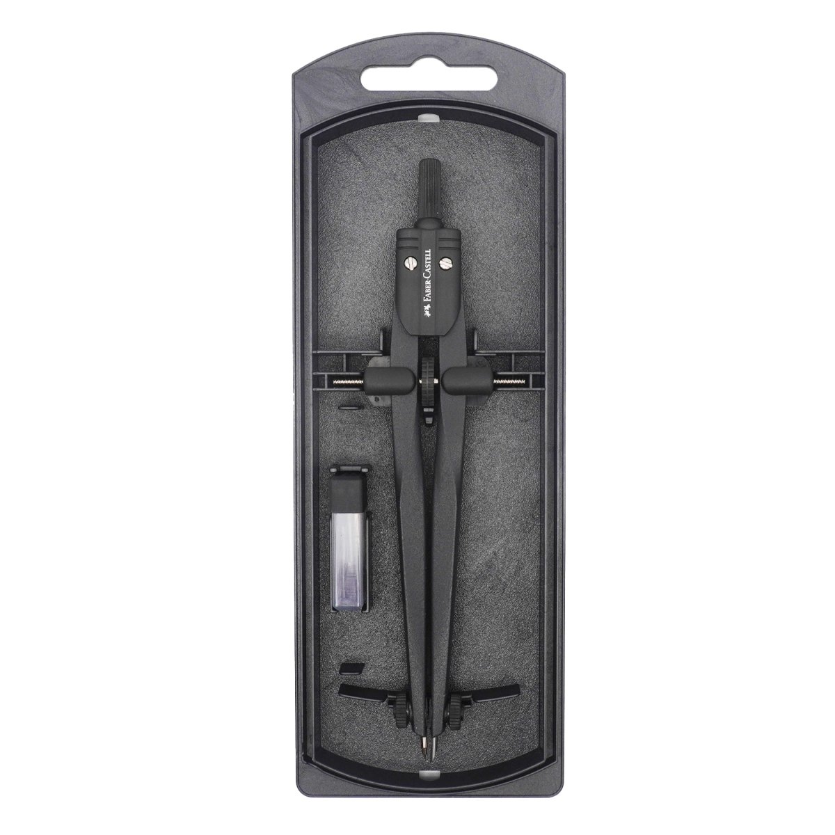 FABER CASTELL Compas scolaire ou professionnel avec mécanisme de réglage rapide, série Stream. Diamètre des cercles jusqu’à 34cm. Mine intégrée + 2 recharges. Noir mat Black stone. La nouvelle génération de compas à réglage rapide! Le top du top pour l’école, l’université ou à ton travail si tu dois mesurer des longueurs et décrire des circonférences. Avec ses roues dentées robustes et ses molettes de réglages fermes sur les côtés, ses branches en métal sont faciles à manipuler. Fini les cercles qui se déforment au fur et à mesure du tracé: La pointe et la mine restent fixes, bien serrées. Ce compas te suivra pendant toutes tes études et bien plus encore. D’autant plus qu’il est si beau avec son design ultra moderne, sobre et épuré.