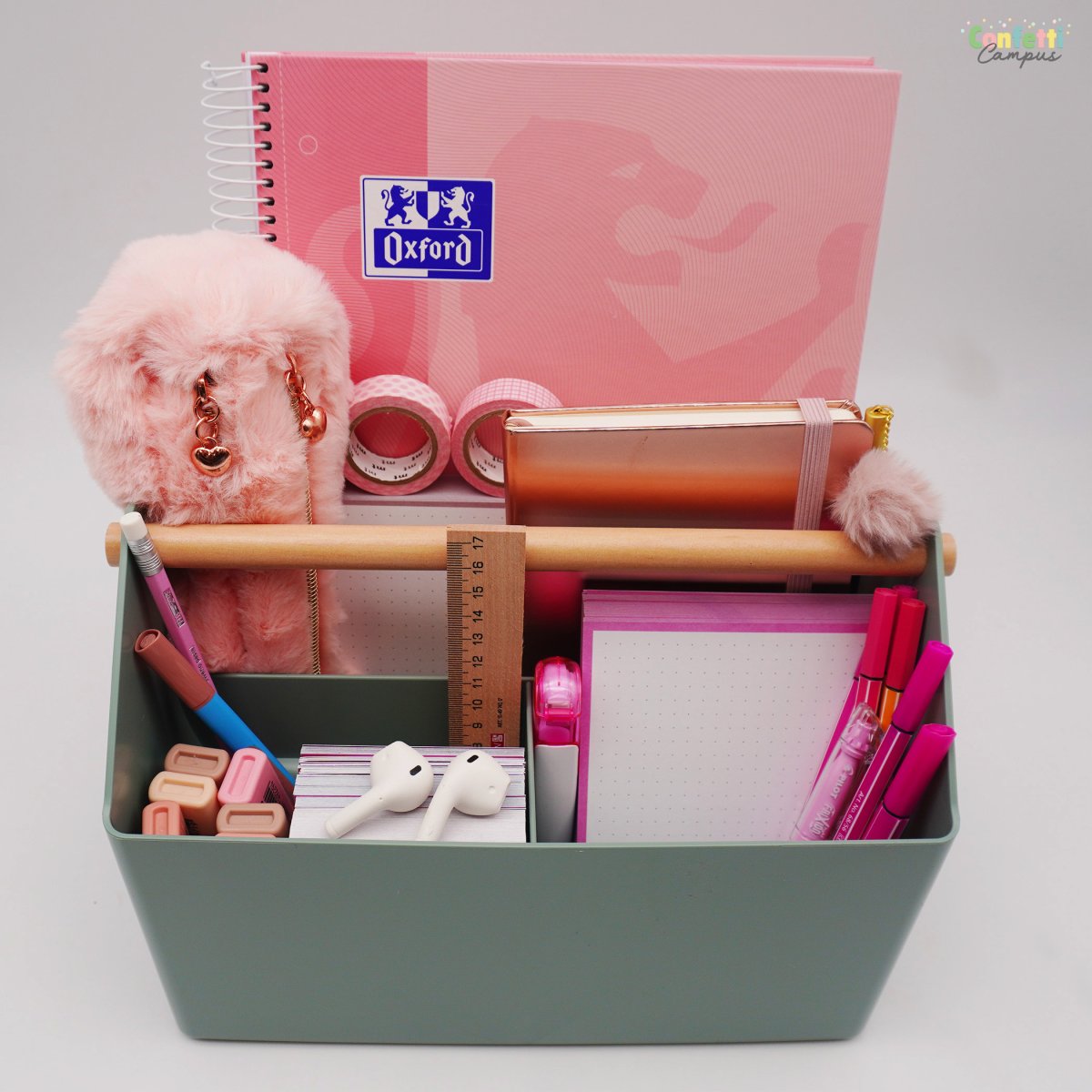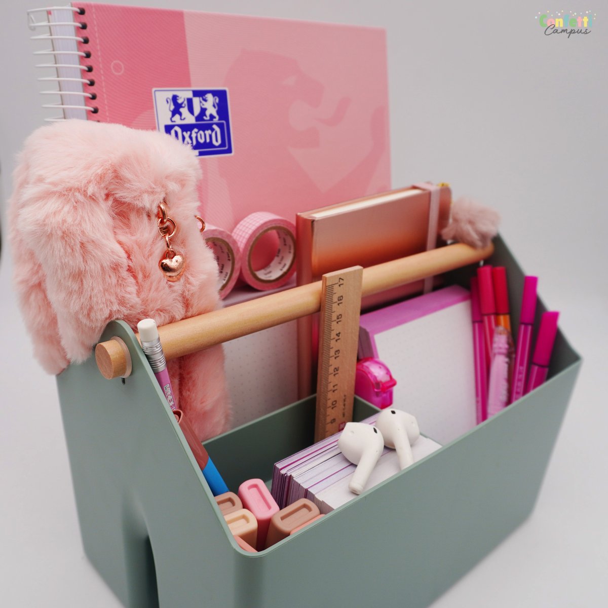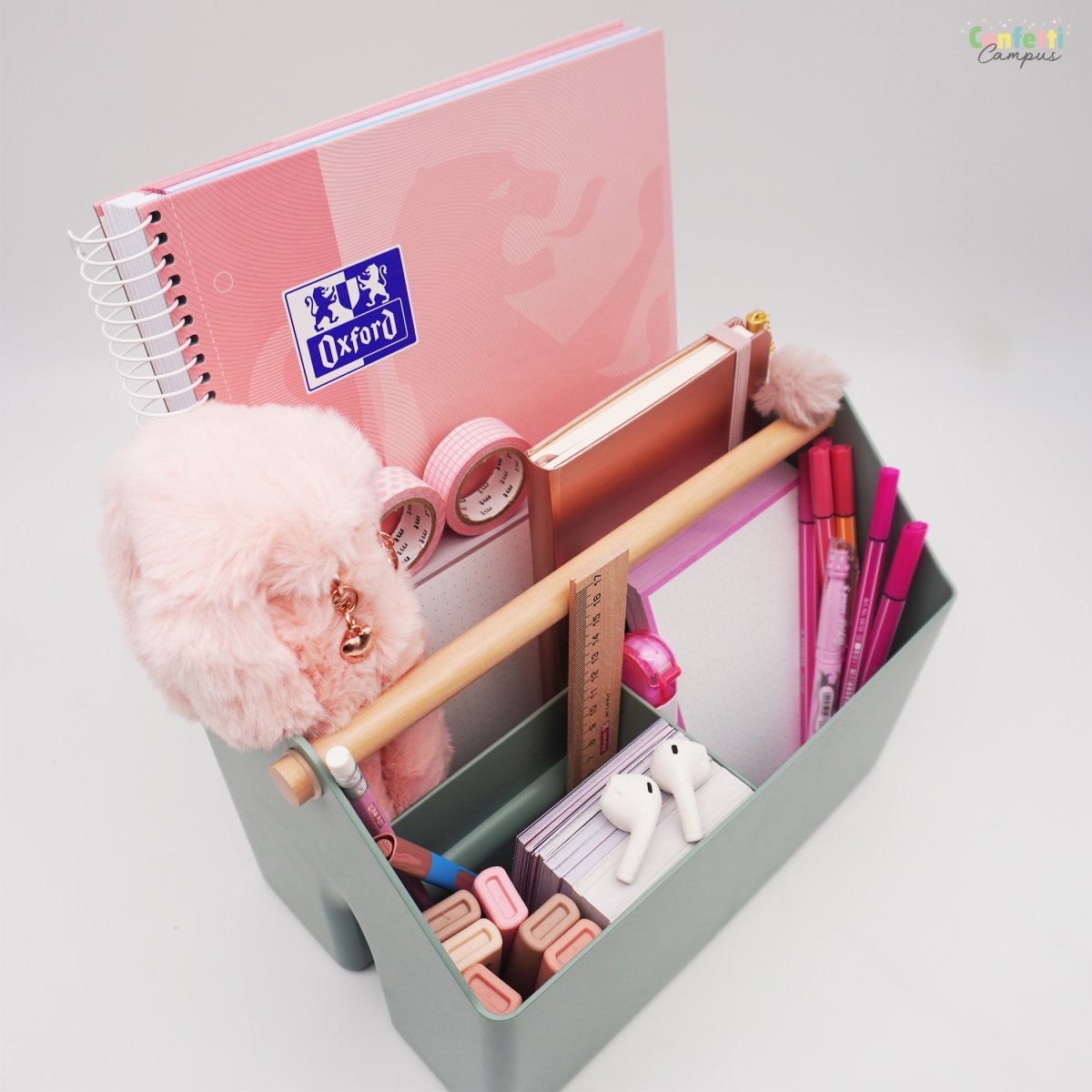 Fabriquée à partir de plastique 100 % recyclé, élégante, pratique et polyvalente, la boîte à outils de bureau LIZ de Forma est en réalité un organisateur ou organiseur de bureau très design. Solide, facile à nettoyer, équipée de plusieurs compartiments spacieux, la boîte à outils LIZ est parfaite pour organiser et désencombrer ton bureau avec style. Tu peux t’en servir comme porte-revue pour y ranger cahiers, carnets, fiches bristol, courrier, factures etc…mais aussi tes petites fournitures scolaires comme ta règle, tes rubans de masking tape, tes post-it, trombones, etc…Sa jolie poignée en bois te permet de la déplacer facilement et ajoute une touche chaleureuse à cette élégant organiseur de bureau.