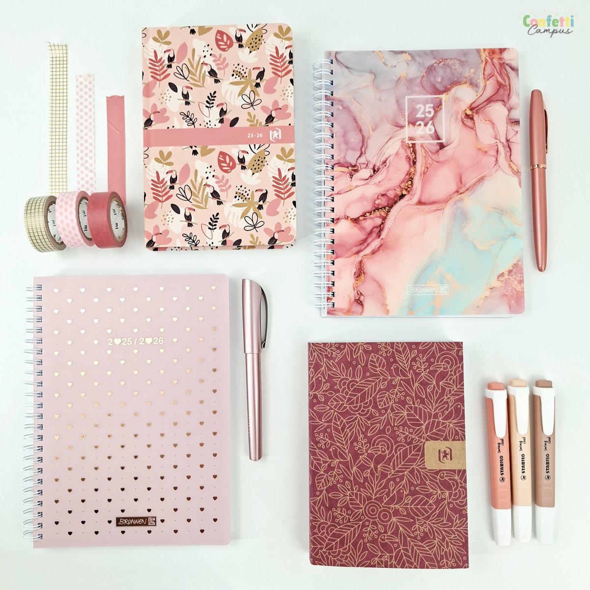 Agenda journalier 2025-2026 Oxford « Les motifs de Camille ». 1 page = 1 jour. Valide de août 2025 à septembre 2026. Format 120 x 180 mm. Broché/Collé. 352 pages. Bandeau rose.