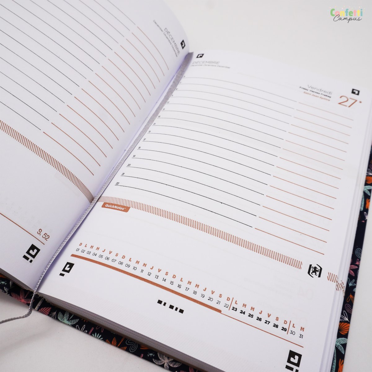 - ORGANISATION AU TOP : en début d’agenda, 2 rabats emplois du temps te permettent de gérer ton planning en semaine A/semaine B. Chaque début de semaine, tu disposes d’une page planning de la semaine à venir pour y noter les événements marquants des jours à venir. Chaque jour, tu disposes d’une pleine page pour y noter tes devoirs et tes rendez-vous.