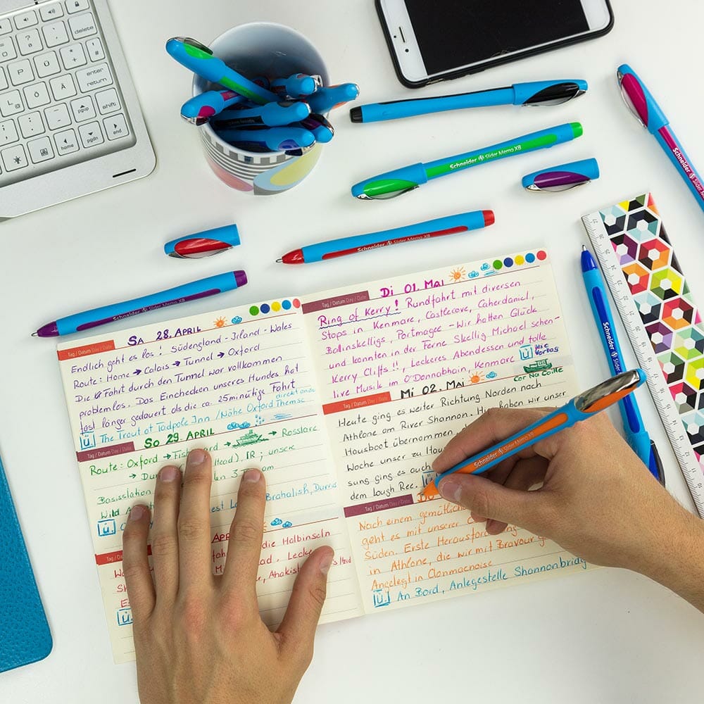 Les stylos-bille Schneider Slider Memo XB sont disponibles dans les couleurs classiques: noir, bleu, vert, violet, rouge, rose et orange. La couleur de l’encre est assortie à la couleur extérieure du stylo.