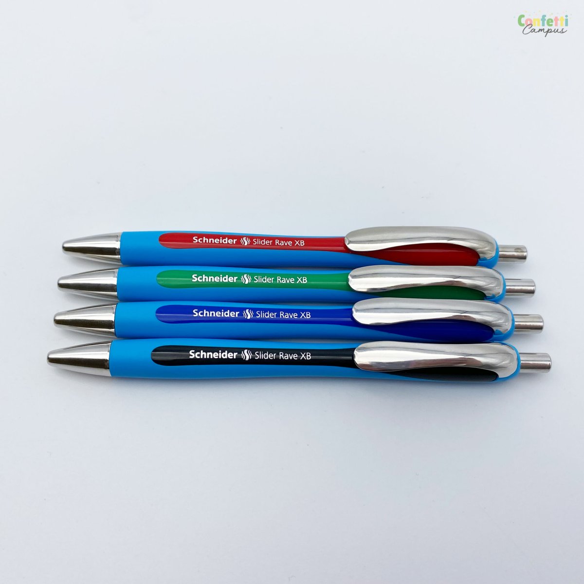 Les stylos-bille Schneider Slider Rave XB sont disponibles dans les couleurs classiques: noir, bleu, vert et rouge.